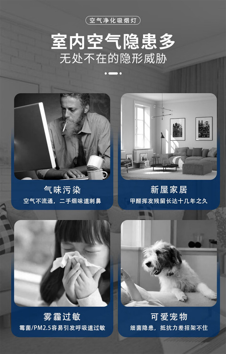 酒店、棋牌室、包間、KTV、會(huì)所、候車廳等除煙除塵凈化燈,集吸煙、照明、裝飾三位一體