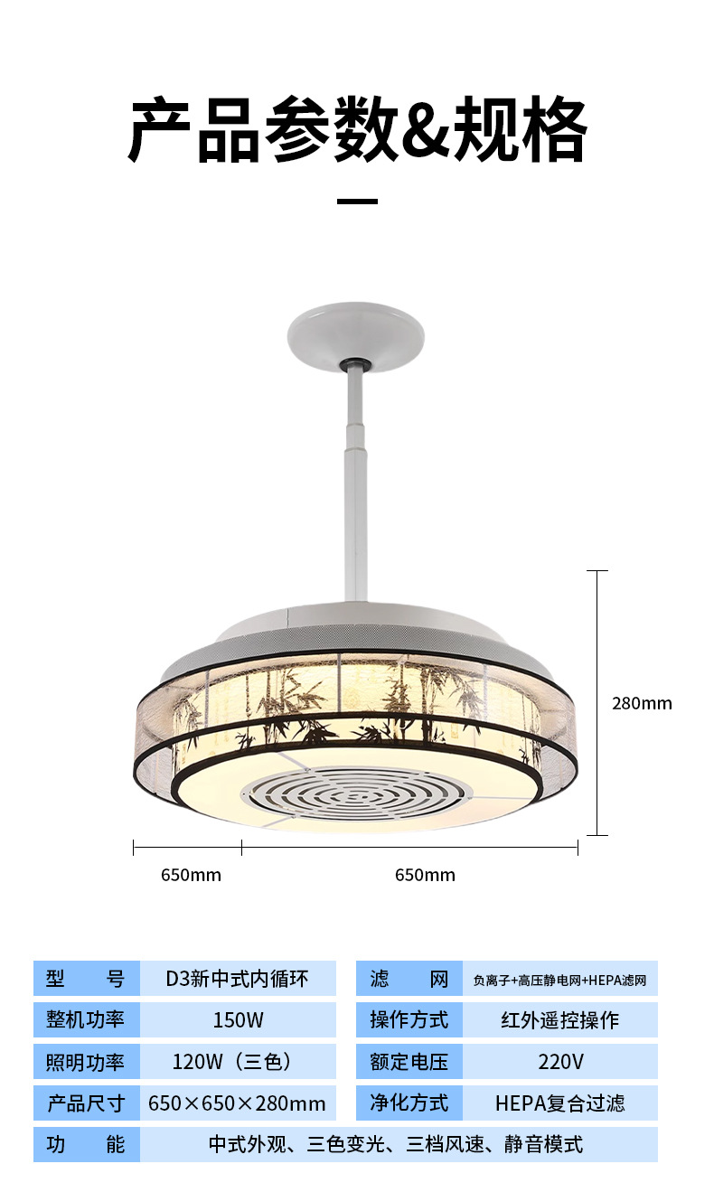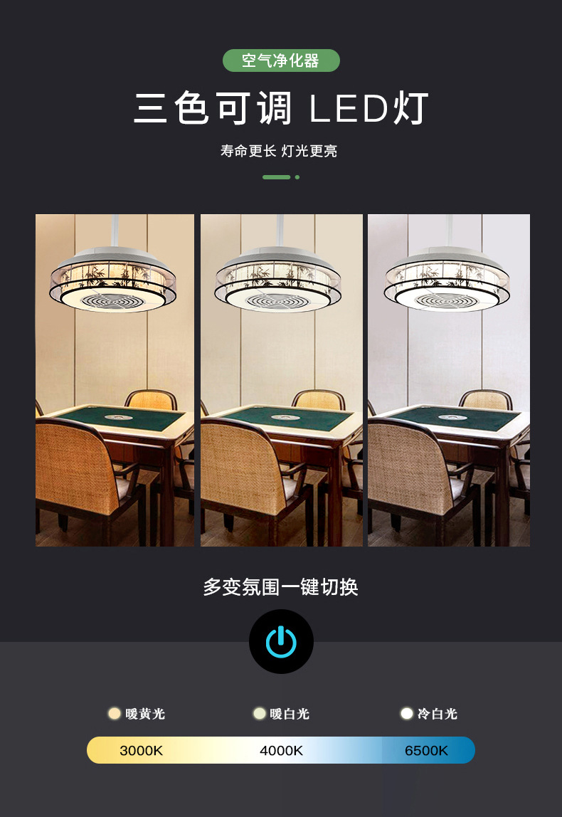 【功能】中式外觀、三色變光、三檔風(fēng)速、靜音模式